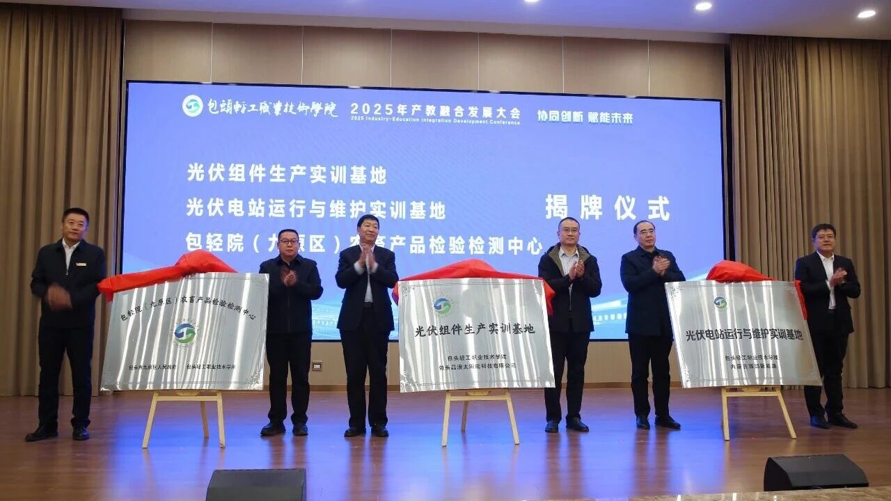 签约仪式后,光伏组件生产实训基地、光伏电站运行与维护实训基地、包轻院(九原区)农畜产品检验检测中心正式揭牌成立。
