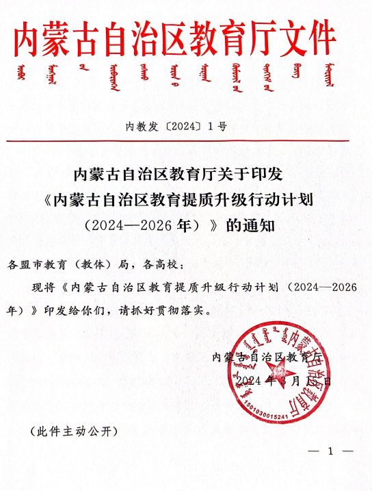 内蒙古自治区教育厅关于印发《内蒙古自治区教育提质升级行动计划(2024-2026)的通知